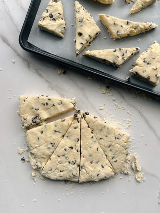 Shape the dough into a circle about 8-9inches across & an inch thick. Cut into 8 even triangles and carefully transfer to your pan. If you want a mini scone, cut the triangles in half.
